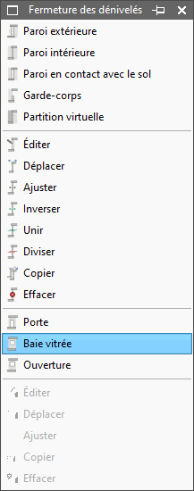 Pour placer une fenêtre dans un mur de fermeture de dénivelé, vous devez la sélectionner dans : ‘Eléments constructifs’ > ‘Fermeture des dénivelés’ > ‘Baie vitrée’.