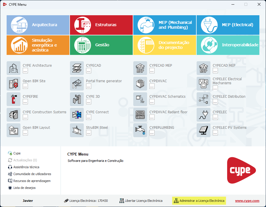 A palavra-passe de utilizador da licença electrónica pode ser alterada utilizando a opção "Administrar a Licença Electrónica" a partir do menu geral de programas CYPE: