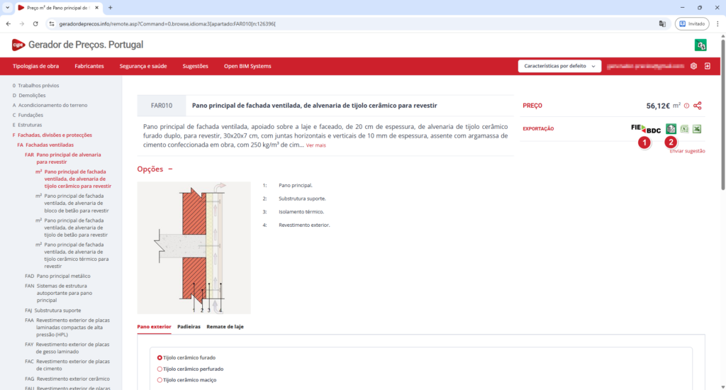 Normalmente, esta opção será utilizada se o programa de orçamentos que irá receber o evento de largar utilizar uma URL direta para o ficheiro BC3 para interpretar a ligação do ficheiro BC3. Para exportar a unidade de obra que está a visualizar, é necessário ter o programa de medições e orçamentos em execução, com o orçamento que está a elaborar aberto. Em seguida, clique no ícone (2) com o botão esquerdo do rato e, sem o soltar, arraste o ponteiro do rato até ao capítulo onde pretende importar a unidade de obra. Assim que o ponteiro estiver no local pretendido, solte o botão esquerdo do rato e a unidade de obra será importada pelo programa de medições e orçamentos. A informação que é copiada é apenas a necessária para obter o preço relativo à unidade de obra que está a visualizar no Gerador de preços.