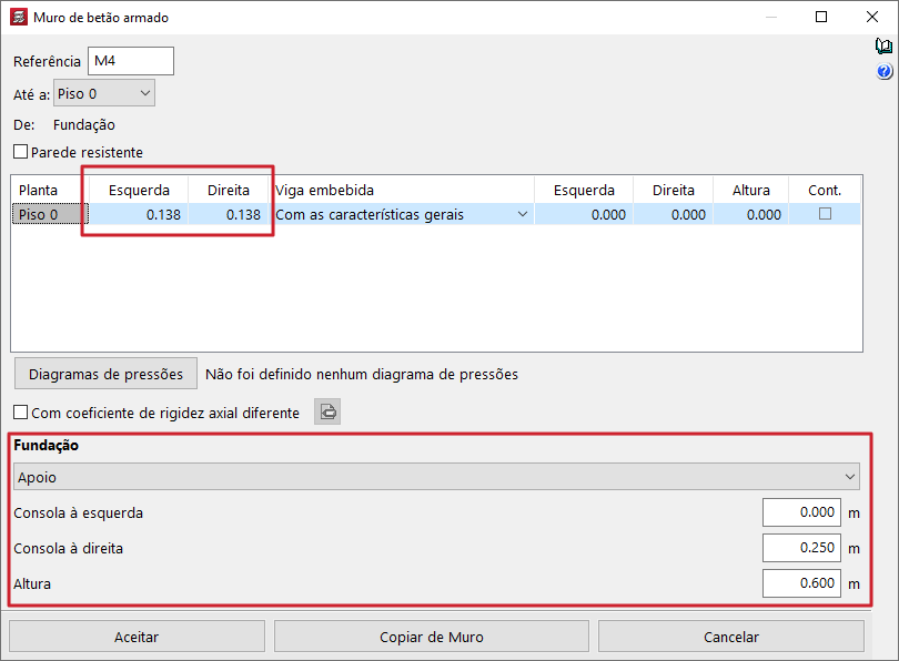 Para o fazer, depois de selecionado o muro a introduzir ("Muro de betão armado", "Muro de tensão plana", "Muro de blocos armados" ou "Muro de alvenaria"), abrir-se-á uma janela na qual poderá definir a espessura do muro, assim como as plantas onde começa e termina. Neste exemplo, a fundação do muro será do tipo “Apoio”, que indica que o muro nasce diretamente sobre uma laje ou sobre uma viga. Posteriormente, pode especificar a altura da viga sobre a qual apoiará o muro.