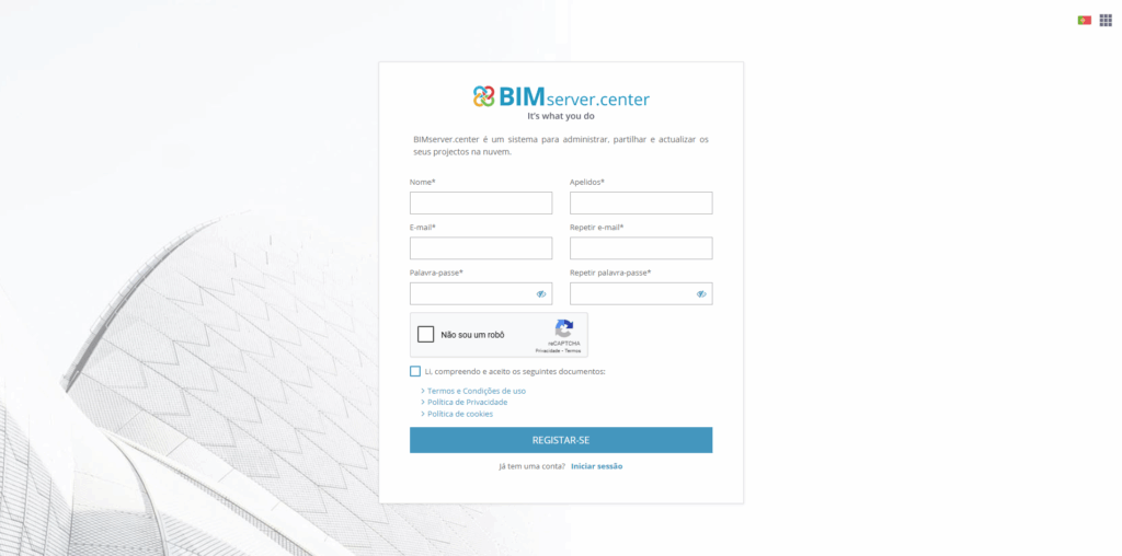 Em primeiro lugar, é necessário registar-se na plataforma BIMserver.center. Para tal, deve proceder da seguinte forma: