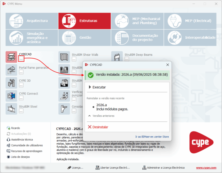 8. Executar ou desinstalar aplicações no CYPE Menu