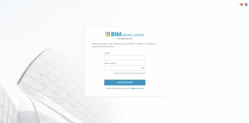 Depois de concluir o registo, deve iniciar sessão no BIMserver.center com a conta, da seguinte forma: