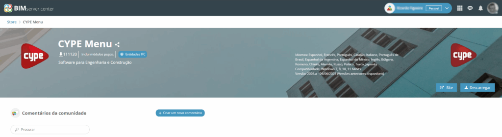 3. Descarregar o CYPE Menu a partir do BIMserver.center