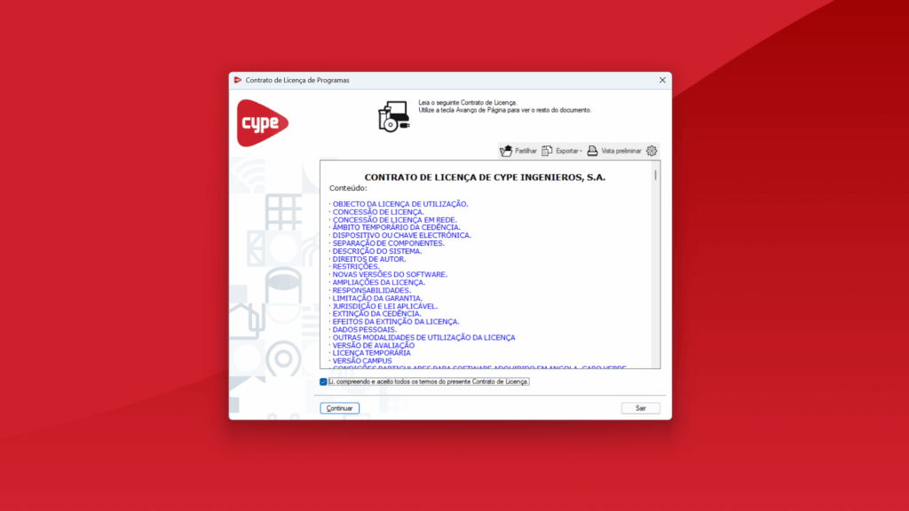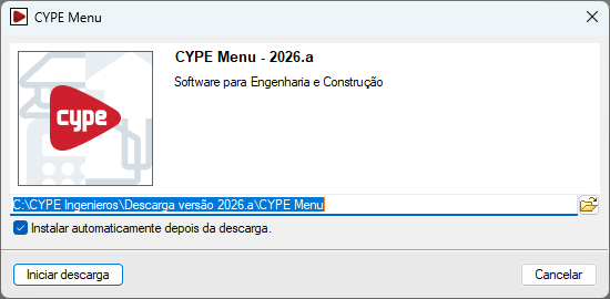 - Se tiver marcado "Instalar automaticamente depois da descarga" no passo anterior, o assistente de instalação será iniciado automaticamente. Caso contrário, deverá procurar e abrir o executável de instalação no idioma correspondente dentro do caminho designado, por exemplo, C:\CYPE Ingenieros\Descarga versão 2026.a\CYPE Menu\Instalação em português\Instalar CYPE Menu.exe. No assistente de instalação, deve aceitar o Contrato de licença e a Cláusula de responsabilidades.