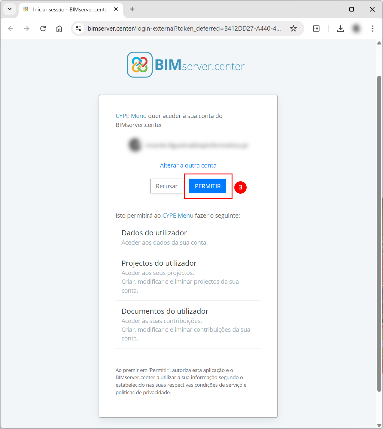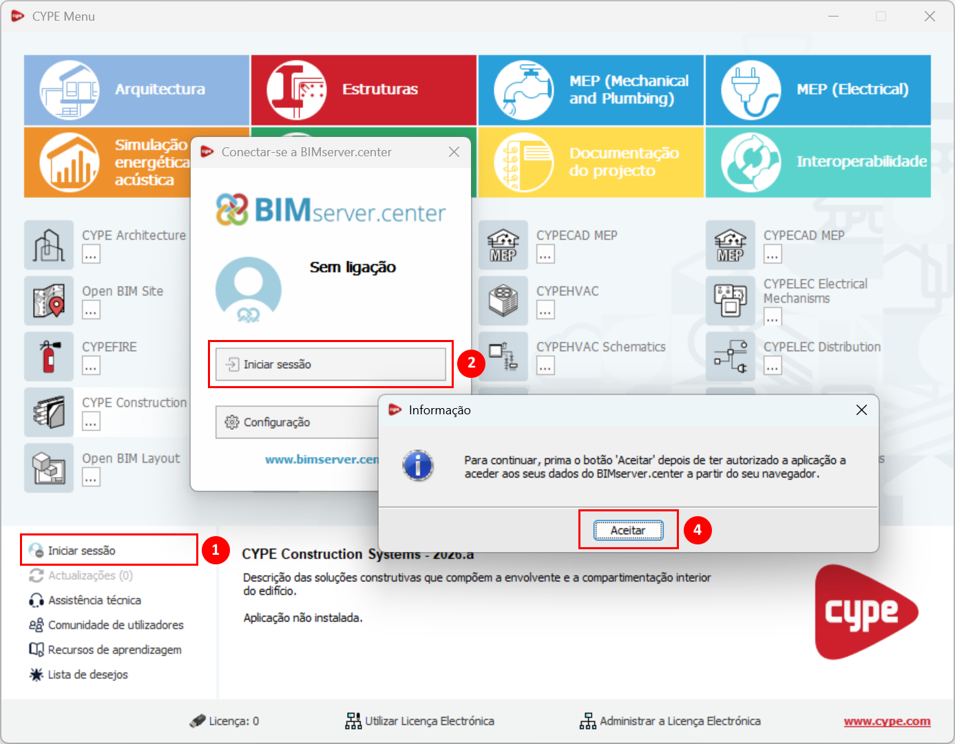 - Clique na opção "Iniciar sessão" na parte inferior esquerda (1) e, em seguida, no botão com o mesmo nome na janela pop-up (2). Será aberta uma página no navegador da web com a mensagem CYPE Menu quer aceder à sua conta BIMserver.center. Aqui, clique em "PERMITIR" (3) e, em seguida, no botão "Aceitar" (4) da janela "Informação".