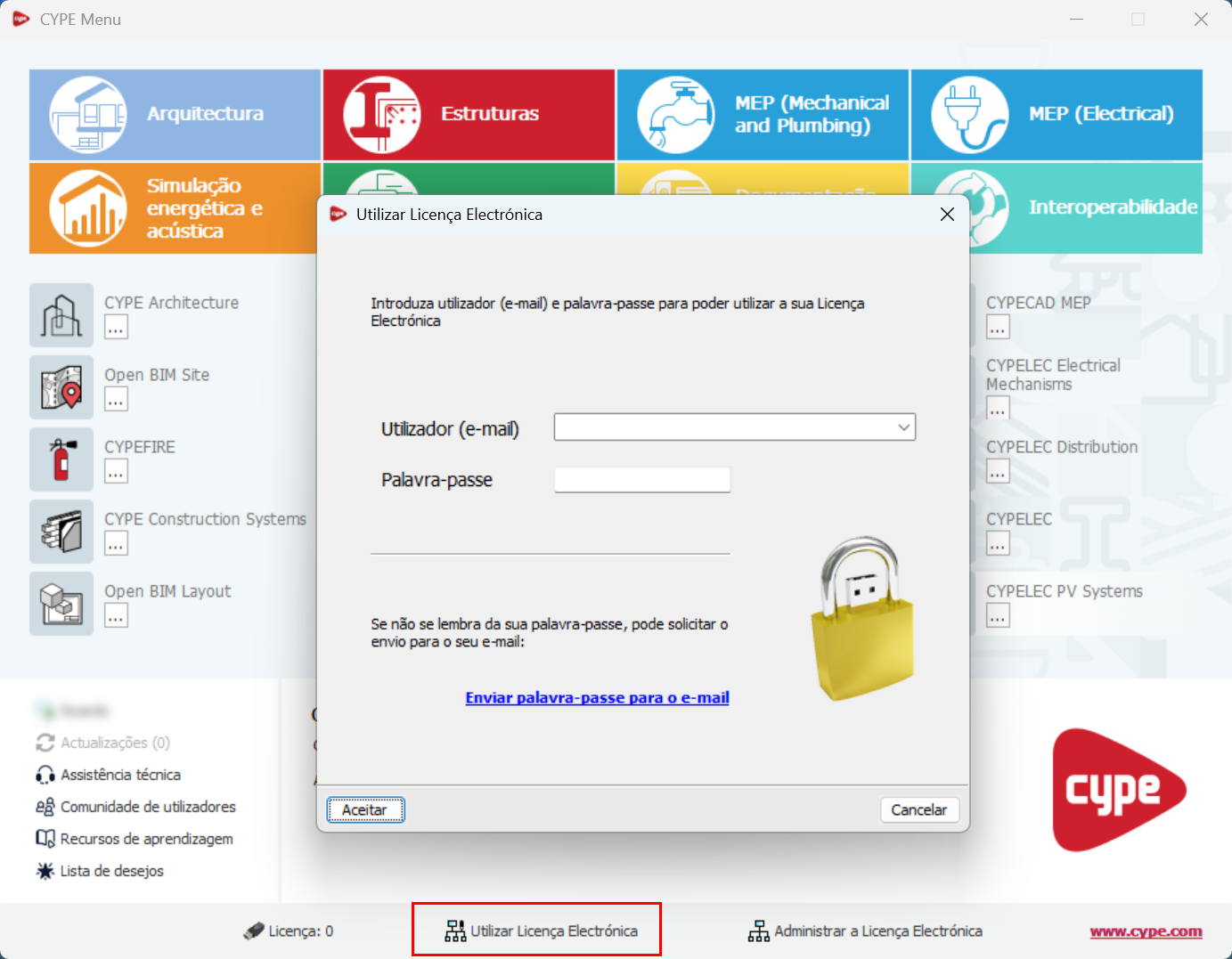 Posteriormente, também no CYPE Menu, deve introduzir o e-mail e a palavra-passe associados à licença CYPE, selecionando a opção "Utilizar Licença Eletrónica" na parte inferior.
