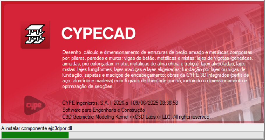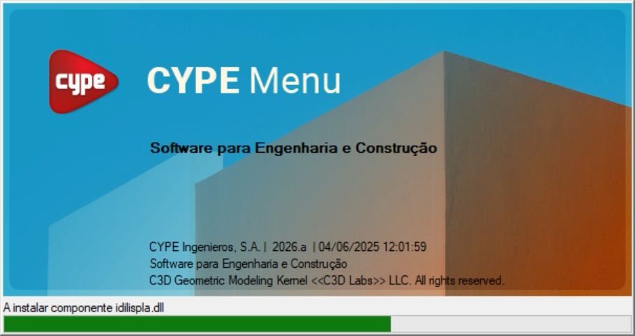 - Se tiver marcado "Instalar automaticamente depois da descarga" no passo anterior, o assistente de instalação será iniciado automaticamente. Caso contrário, deverá procurar e abrir o executável de instalação no idioma correspondente dentro do caminho designado, por exemplo, C:\CYPE Ingenieros\Descarga versão 2026.a\CYPE Menu\Instalação em português\Instalar CYPE Menu.exe. No assistente de instalação, deve aceitar o Contrato de licença e a Cláusula de responsabilidades.