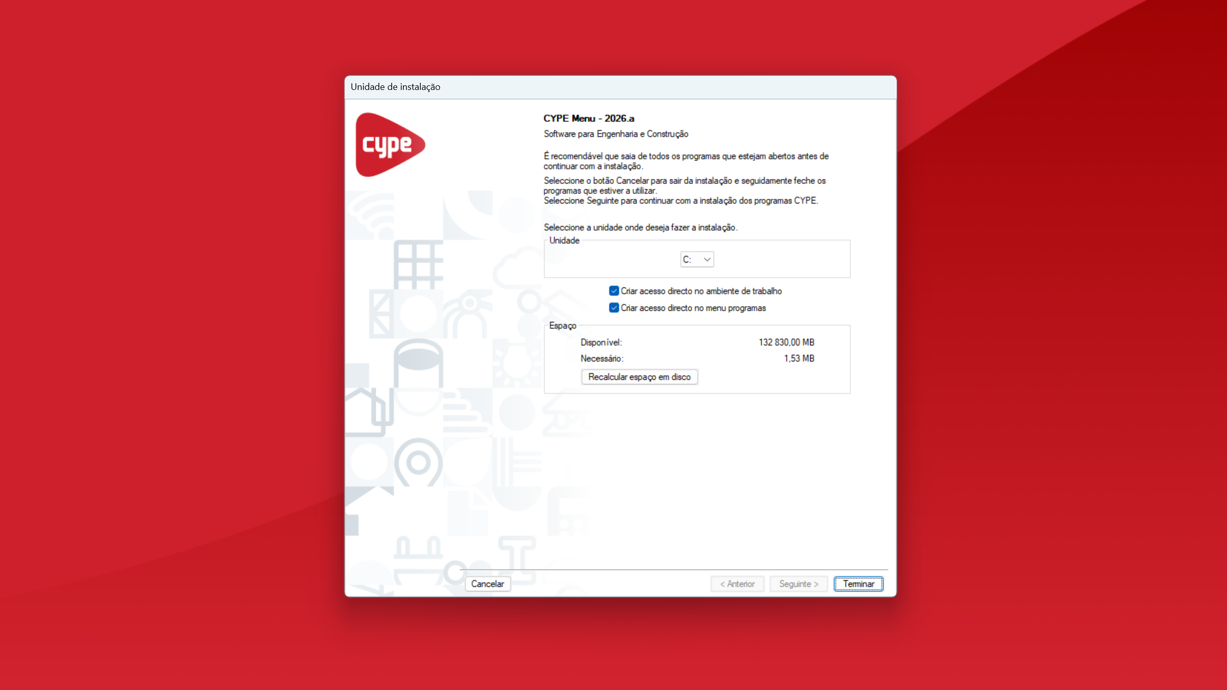 - Selecione em que unidade pretende realizar a instalação. Isso determinará o caminho de instalação da aplicação. Por exemplo, o caminho de instalação do CYPE Menu 2026 é o seguinte: C:\CYPE Ingenieros\Versão 2026\CYPE Menu. É possível ativar as opções para criar atalhos na área de trabalho e no menu "Programas", se o desejar. Por fim, clique em "Terminar".