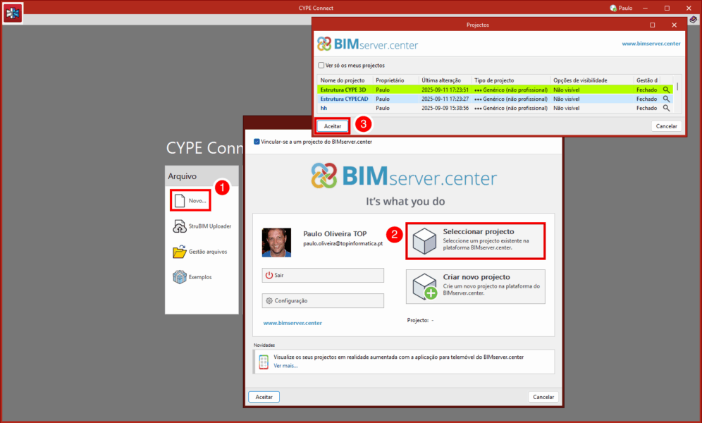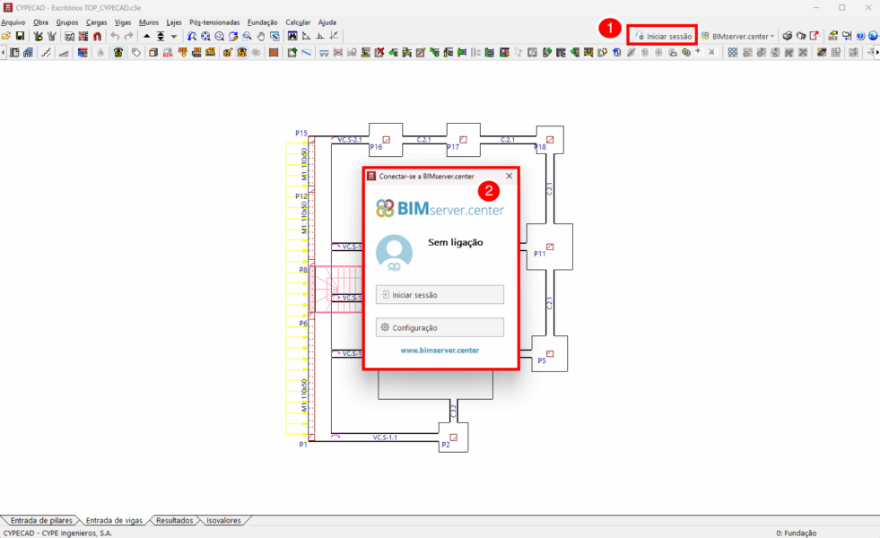 Depois, executa-se o CYPECAD ou CYPE 3D. Deve novamente identificar-se na conta do BIMserver.center, pode fazer de duas distintas formas: