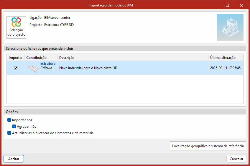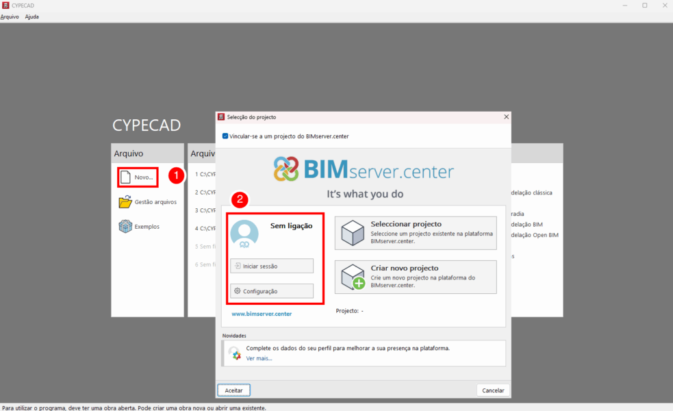 Seguidamente, é necessário abrir uma obra “Nova“. O assistente de “Importação de modelos BIM” permite selecionar o projeto do BIMserver.center criado previamente.
