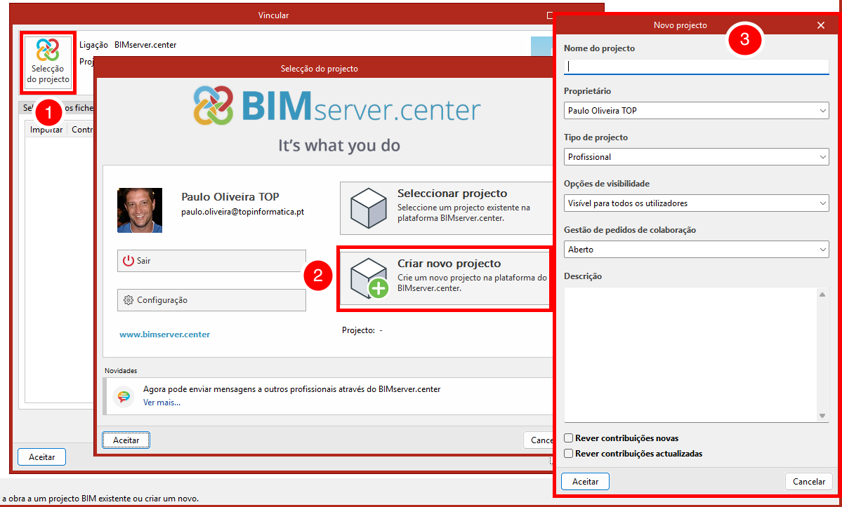 Depois, em “Selecção do projecto“, é possível selecionar um projeto do BIMserver.center criado previamente, ou utilizar “Criar novo projecto” para fazê-lo nesse momento: