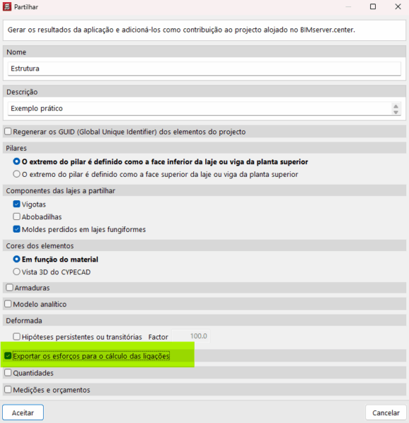 Na janela de exportação do ficheiro em formato IFC, ativa-se a opção “Exportar os esforços para o cálculo das ligações“: