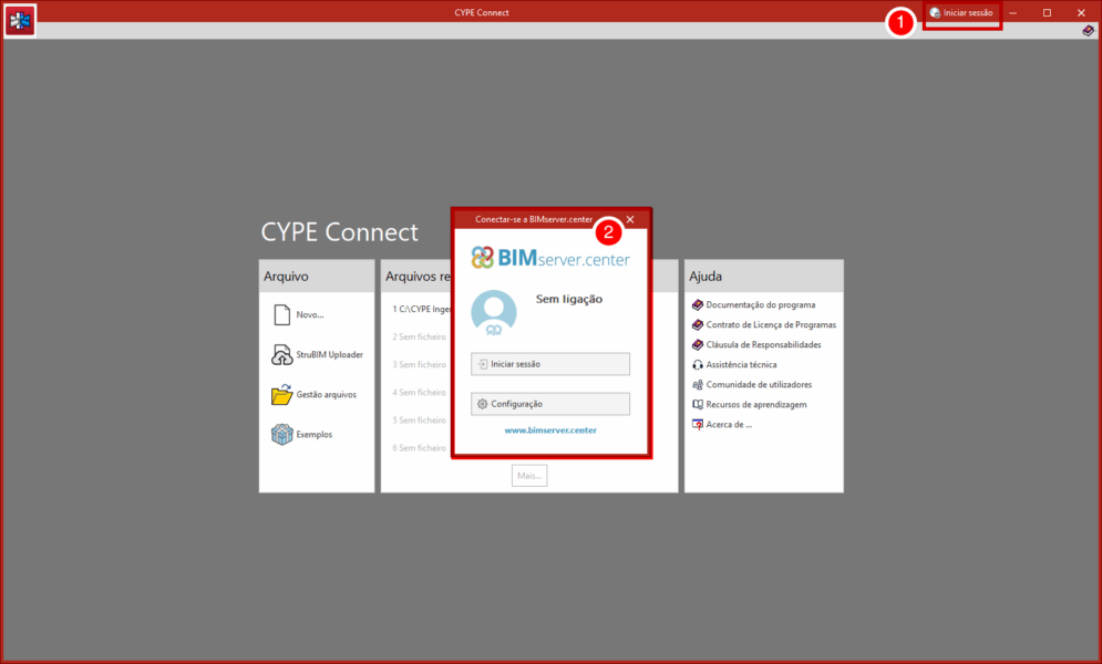 Executa-se o CYPE Connect. Na parte direita da barra de título surge um botão com o nome do utilizador do BIMserver.center. No caso de estar desconectado, prime sobre “Ligar” e na janela que surge indique o “E-mail” e a “Palavra-passe“.