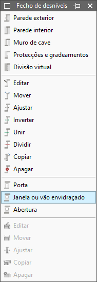 Se a parede estiver corretamente introduzida, introduzir uma janela numa parede de fecho de desnível é muito simples, basta aceder ao menu "Elementos" > "Fecho de desníveis" > "Janela ou vão envidraçado”.