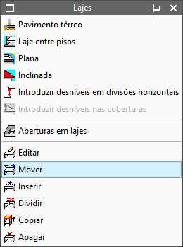 Pode alterá-las movendo as arestas ou vértices de aberturas ou lajes. Para isso, utilize a opção disponível em “Elementos” > “Lajes” > “Mover”: