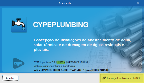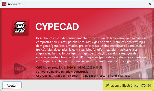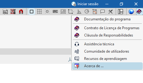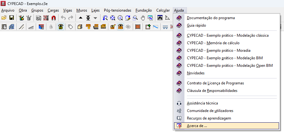 Para saber qual a versão e número de licença que está a utilizar num programa CYPE, abra o menu "Ajuda" na parte superior do programa e clique na opção "Acerca de":