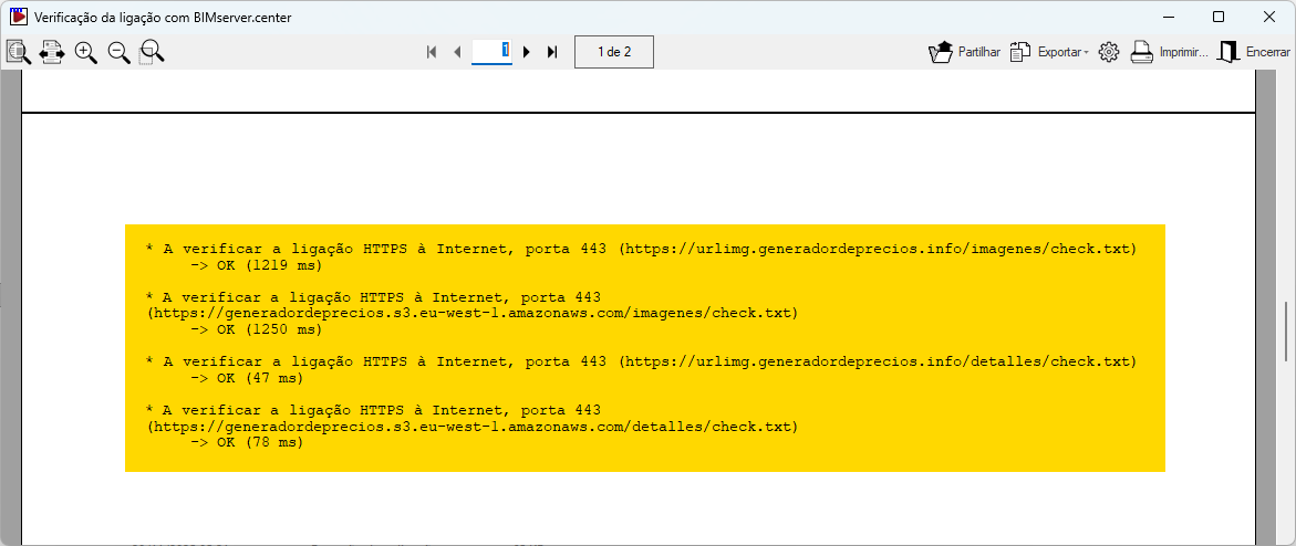 - Desta forma é gerado o documento "Verificação da ligação com BIMserver.center". Nas últimas entradas deste documento, pode aparecer algum aviso indicando as portas que estão a falhar e um ou vários endereços URL, em vez de indicar "OK"(*). Copie esses endereços URL.