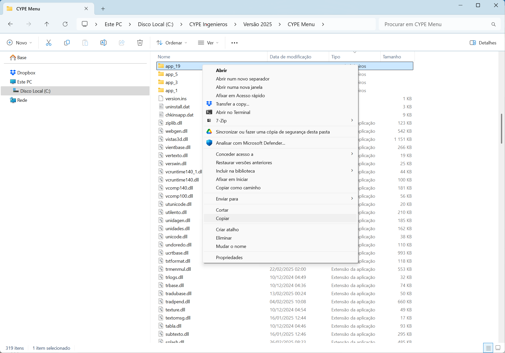 - Copiar e colar manualmente as pastas de instalação de todas as aplicações a partir de C:\CYPE Ingenieros\Versão 2025\CYPE Menu\ para C:\CYPE Ingenieros\Versão 2026\CYPE Menu\. As pastas das aplicações sãs as pastas "app_XX" (sendo XX o número de identificação de cada aplicação). Devem apenas ser copiadas exclusivamente estas pastas "app_XX" de um caminho para o outro. Não devem ser copiados os restantes ficheiros presentes na pasta nem a pasta "no_uninstall", pois esses foram já criados com o processo de instalação do CYPE Menu 2026.