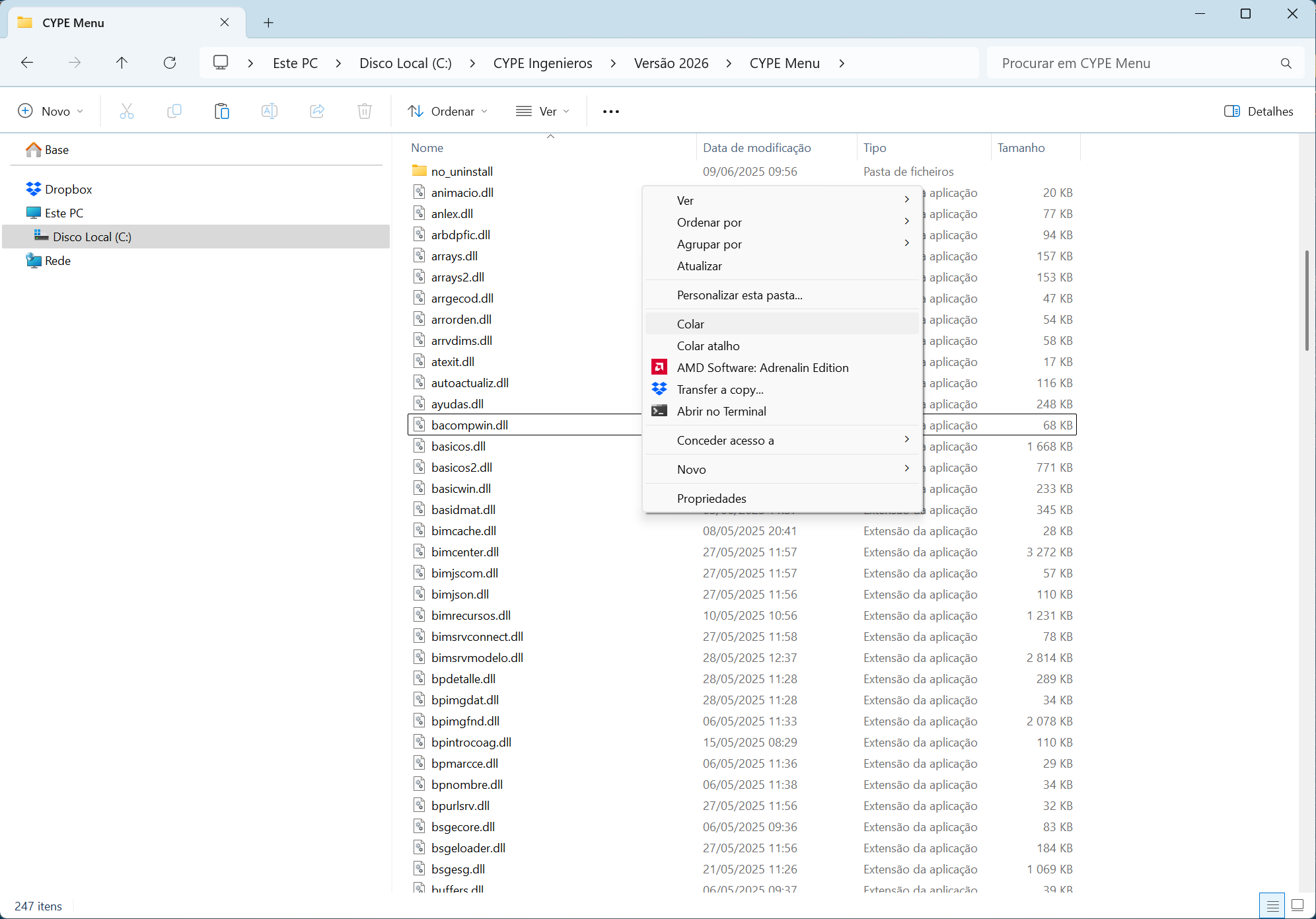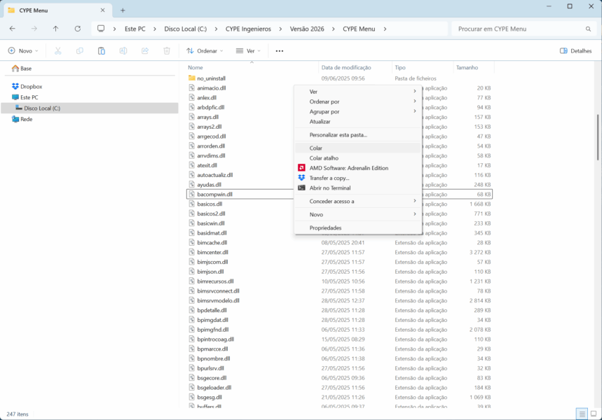 Isto ocorre porque as aplicações instaladas com o CYPE Menu 2025 são guardadas em C:\CYPE Ingenieros\Versão 2025\CYPE Menu\, enquanto que com o CYPE Menu 2026 são guardadas em C:\CYPE Ingenieros\Versão 2026\CYPE Menu\.