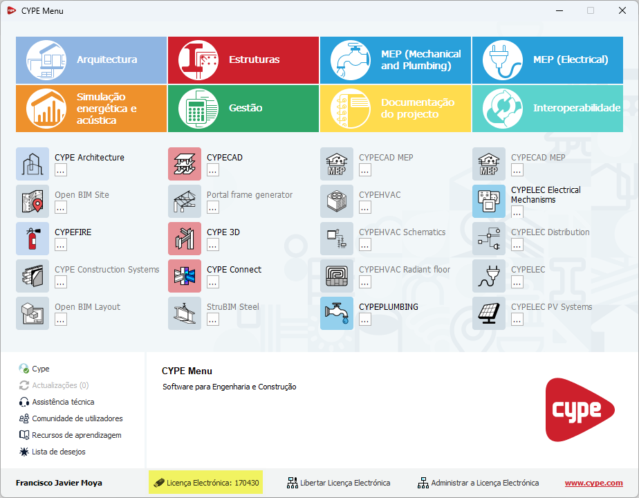 Para consultar as permissões disponíveis na licença CYPE a partir da interface do CYPE Menu, deve-se clicar sobre o número da licença, na parte inferior.