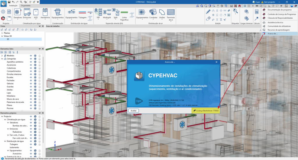 Para consultar as permissões disponíveis na licença CYPE a partir da interface de um programa CYPE, é necessário clicar sobre o botão "Ajuda" na parte superior do programa e selecionar a opção "Acerca de".