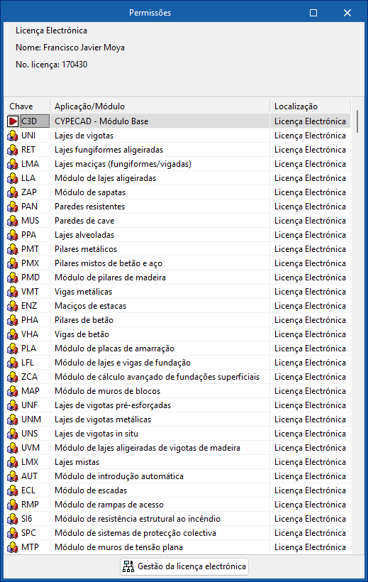 Para conhecer as quais são as permissões disponíveis na licença CYPE que estiver a utilizar, pode seguir os seguintes métodos: